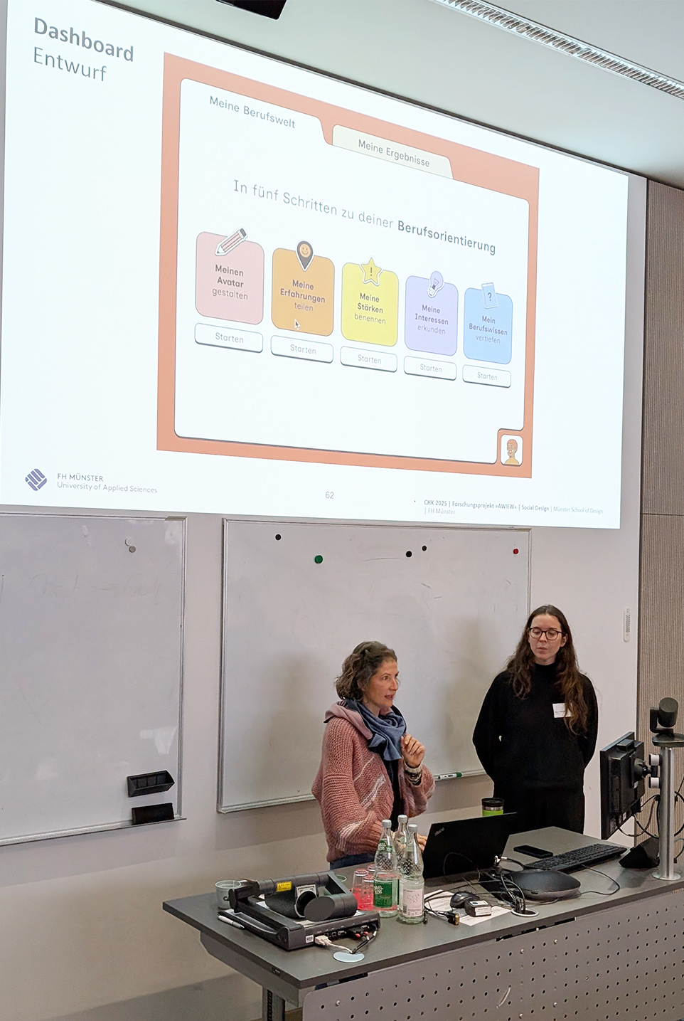 In dem Beitrag »Partizipative Entwicklung des Bedarfsanalyseinstruments: Mit Co-Designer*innen testen und gestalten« stellte das Social Design Team, vertreten durch Diana Cürlis und Mara Vöcking, die Arbeit an der Schnittstelle zwischen Tool-Entwicklung und Mensch-Zentrierung vor und gab Einblicke in generative und evaluative Workshops sowie in die zugrunde liegenden Arbeitsprozesse. Ein Schwerpunkt lag auf der Vorstellung des Moduls »Berufsinteressenstest«, dessen Neukonzeption und Entwicklung durch das Team erläutert wurde. Der Beitrag beleuchtete die herausgearbeiteten Bedarfe und zeigte, wie Bildwelten gemeinsam mit Co-Designer*innen mit Behinderung getestet und weiterentwickelt wurden, ebenso wie die fortschreitende gestalterische Entwicklung des Bedarfsanalyseinstruments und dessen kontextuelle Einbindung.
